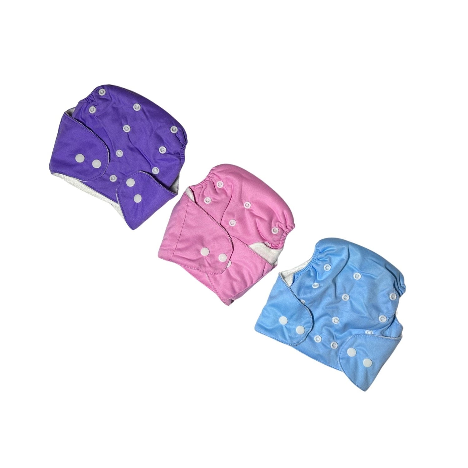 These reusable baby cloth diapers come in vibrant colors (purple, blue, and pink) and include soft, absorbent liners for enhanced comfort and protection. They are adjustable, eco-friendly, and designed to fit snugly, providing a sustainable alternative to disposable diapers.